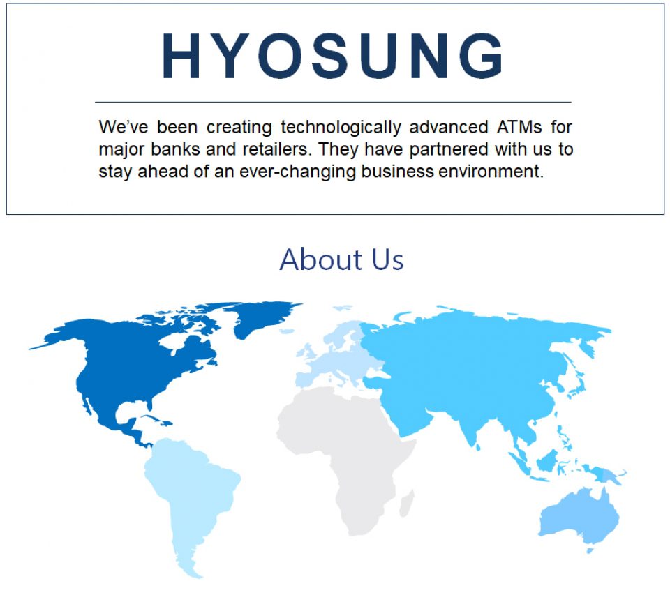 Hyosung 는 소매점 및 금융기관 시장에 ATM을 공급하는 글로벌 리더인 한국에 본사를 둔 Hyosung 의 북미 자회사입니다. Hyosung 는 1998년 북미 시장에 진출한 이래 미국 최대의 ATM 공급업체로 성장했습니다. Hyosung 는 텍사스주 어빙에 본사를 두고 있으며 오하이오주 데이턴에 위치한 글로벌 소프트웨어 센터에서 연구 개발 지원을 제공하고 있습니다.